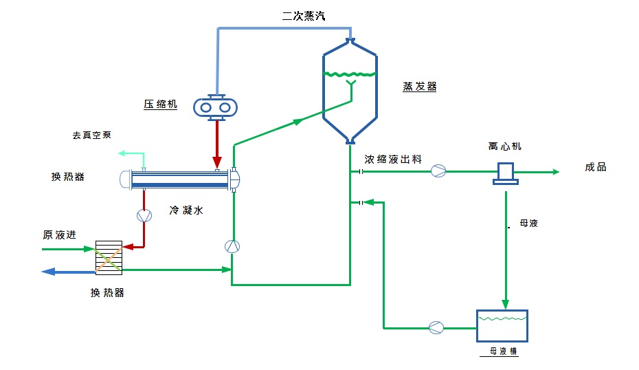 蒸發系統內部液位隨著不斷蒸發減少,液位計會聯動進料泵及調節閥控制進料,進料先經一、二級預熱器預熱至約60-80℃,熱源為約75-90℃冷凝水,再進入蒸發系統內,蒸發系統內部壓力在-40~-30Kpa,預熱后的料液進入系統后壓力降低形成蒸發,蒸發產生的二次蒸汽溫度在 90-92℃,二次蒸汽由蒸汽壓縮機引入壓縮提高壓力和溫度,壓縮機壓縮溫度提高至106-108℃,再供給加熱器最為熱源,形成循環加熱利用。