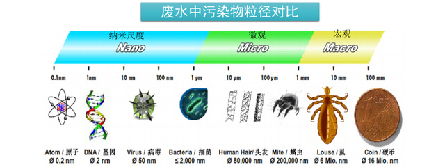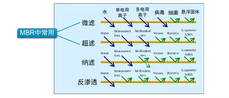 MBR膜式由不同孔徑的高分子材料組成的一種特殊的化學(xué)制品,分別為微濾膜、超濾膜、納濾膜和反滲透膜幾種,下圖就是MBR膜不同孔徑下可以阻隔或截留的各種物質(zhì)的類型: