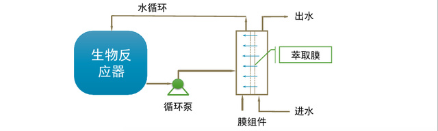 這種系統(tǒng)比較少的應(yīng)用于大規(guī)模項(xiàng)目中,主要使用萃取膜將污水與生物反應(yīng)器進(jìn)行隔離,利用萃取膜的選擇透過(guò)性,使目標(biāo)污染物透過(guò),并進(jìn)入生物反應(yīng)器進(jìn)行降解,而有毒有害的物質(zhì)則被隔離。