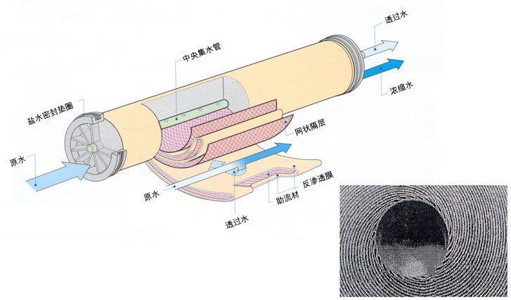 反滲透(Reveser Osmosis,簡(jiǎn)稱RO)是以壓力為驅(qū)動(dòng)力,并利用反滲透膜只能透過(guò)水而不能透過(guò)溶質(zhì)的選擇性而使水溶液中溶質(zhì)與水分離的技術(shù),因?yàn)楹妥匀粷B透的方向相反,因此稱為反滲透。其工作壓力很高(1~25MPa)。