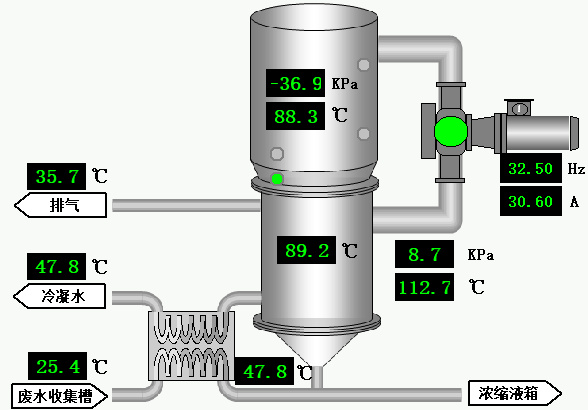 ③蒸發(fā)罐內(nèi)為-35至55KPA(可設(shè)定)負(fù)壓條件運(yùn)行,污水升溫至80-90℃開(kāi)始沸騰,產(chǎn)生大量水蒸汽。
